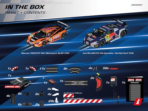 In the Carrera DIGITAL 132 set “Victory Circuit”, the McLaren 720S GT3 “Dörr Motorsport, No.85” and the Audi R8 LMS GT3 “Abt Sportsline, Kelvin v.d. Linde, No.3”, which is exclusively available in this set, fight a thrilling duel to see who will leave the track as the winner. In the 2024 DTM season, the McLaren 720S GT3 from Team Dörr Motorsport proved why the car is known for its remarkable speed and excellent handling. The Audi R8 LMS GT3 Evo II from Abt Sportsline, driven by the experienced drivers of the Kempten-based team, was also able to prove its excellence on the track. On the 7.3 meter long track, the GT3 icons chase through fast straights, sharp bends and tight passages. Every moment feels like you’re at the wheel yourself, battling for victory. The set brings the adrenaline rush of the DTM races directly into your living room – thrilling motorsport full of passion and top speed.