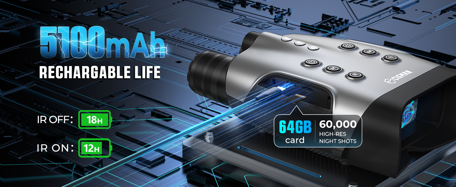 【64GB Storage & Long-Lasting Performance】 Equipped with a 64GB memory card for extensive photo and video storage, the CNVPRO also offers extended battery life for uninterrupted field operation. Record hours of footage without worrying about space or power—perfect for long outdoor sessions, surveillance, or research missions.