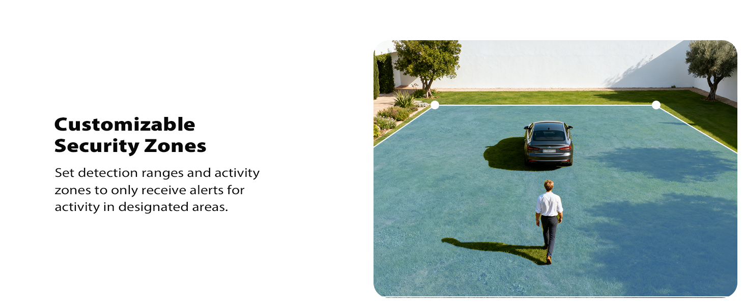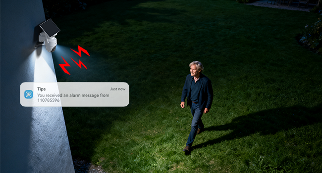 Deter intruders with personalized audio alarms and adjustable built-in spotlights.