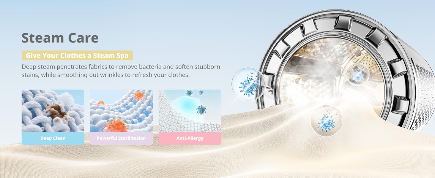 【Steam Care】The advanced Steam Function removes common bacteria and odours, while the 90°C Drum Clean keeps the machine fresh — ideal for families with children and sensitive skin