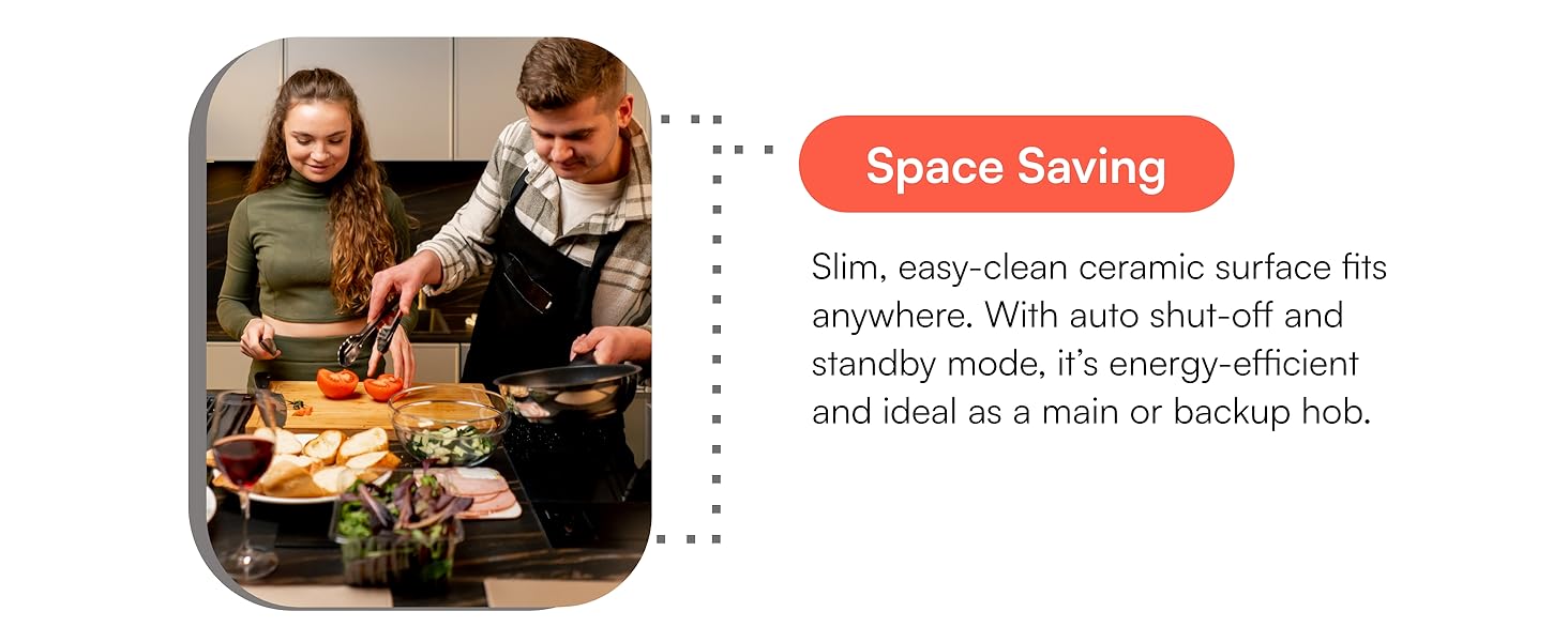 ENERGY- SAVING TECHNOLOGY: Auto shut-off, smart pan detection (heats only when cookware is present), and 0.6 W standby help reduce wasted energy during everyday use.