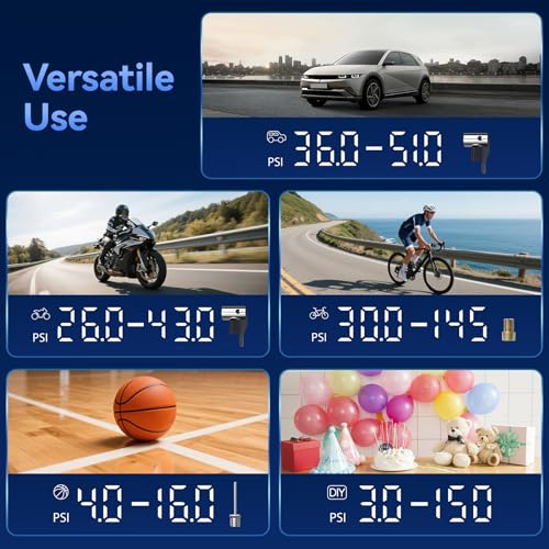 【Easy to Use】The tire inflator is designed with 5 smart modes, suitable for cars, motorcycles, bicycles, balls, and DIY customization. You can switch modes by short pressing the mode button according to your inflation needs. And portable air pump has 4 preset pressure units (PSI, KPA, BAR, KG/CM ²). You can preset exclusive pressure values (3-150PSI) for different inflation needs