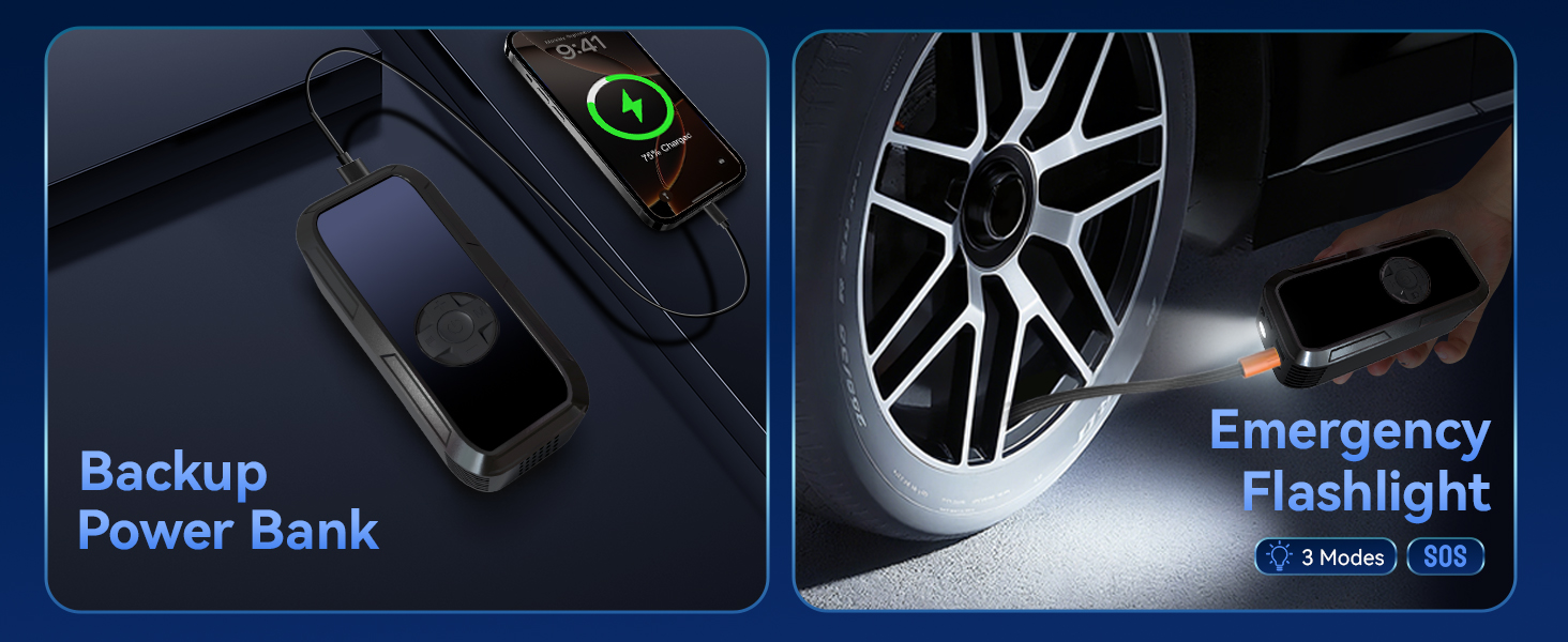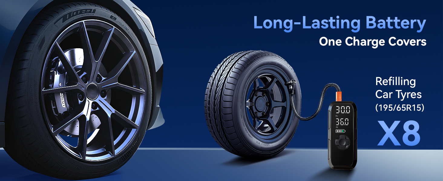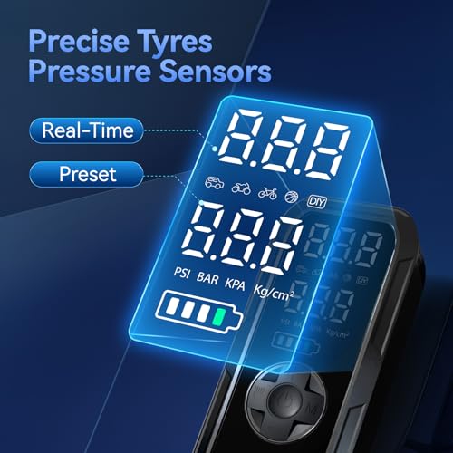 【Precise Tyres Pressure Sensors】The electric car air pump is equipped with ultra high brightness LCD dual display screens, built-in high-precision digital sensors, with an error of only ±1 PSI. It provides you with the most intuitive data reading experience, ensuring clear visibility even in strong light or dark nights