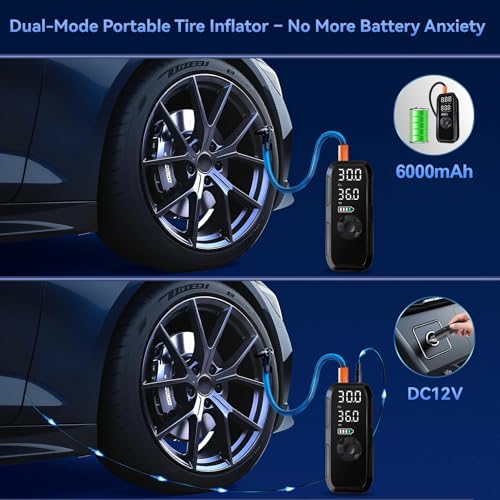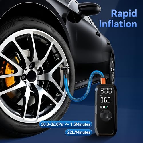 【5x Faster Inflation】Vulisox wired/cordless tire inflator equipped with dual power sources of 6000mAh battery and 12V DC cigarette lighter. The flow rate of the 22 cylinder metal cylinder machine is 20-22L/min, with a maximum pressure of 150PSI. The inflation speed is 5 times faster, and the tire can be inflated from 30PSI to 36PSI in 1.5 minutes