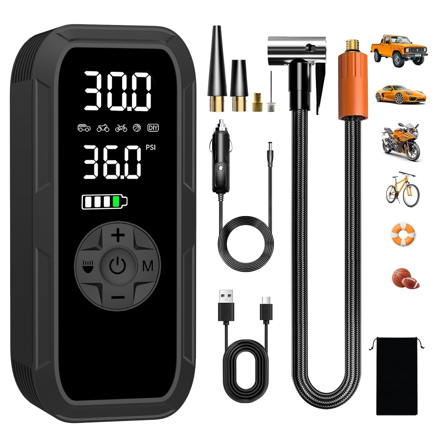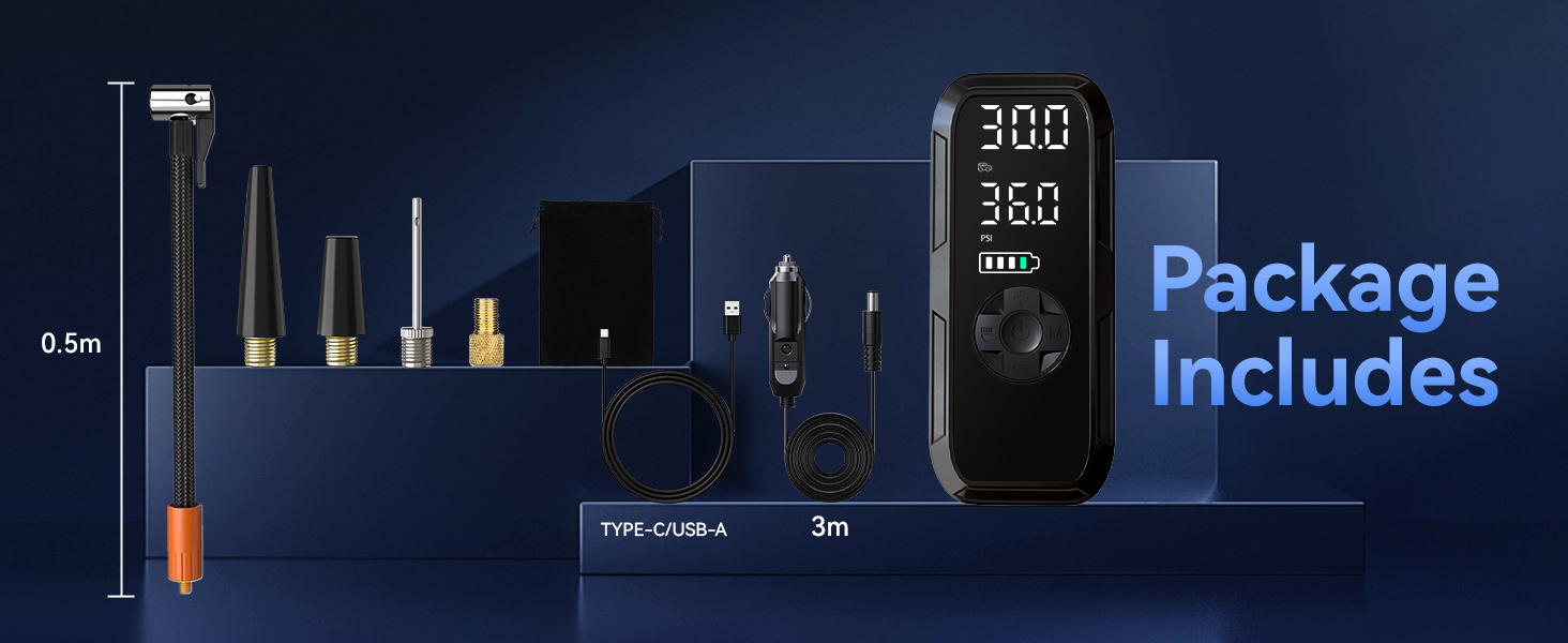 【Packaging Includes】portable air pump x 1, 500mm American trachea x 1, ball pin x 1, swimming ring nozzle x 2, French nozzle x 1, TYPE-C charging cable x 1, waterproof cloth bag x 1 (can hold all accessories), 3-meter DC cable x 1, glove x 1, user manual x1. If you have any questions about tyre pump, please contact us