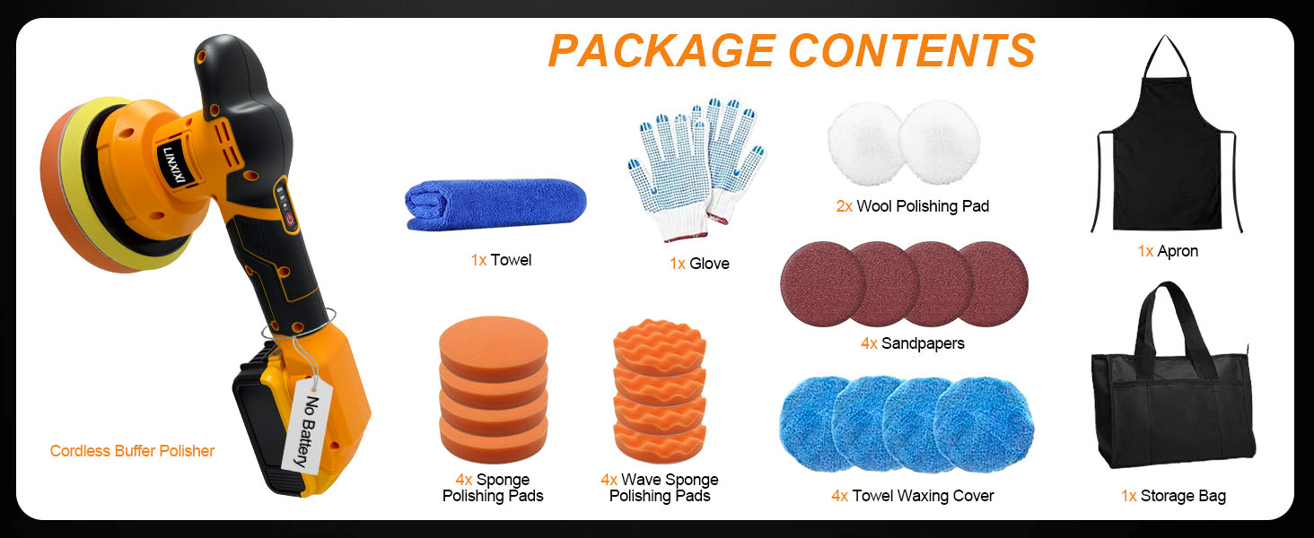 COMPLETE KIT: Includes cordless buffer and 22 accessories with 4x sponge polishing pads, 4x wave sponge polishing pads, 4x towel waxing covers, 2x wool polishing pads, 4x sandpapers, 1x towel, 1x glove, 1x apron, 1x storage bag