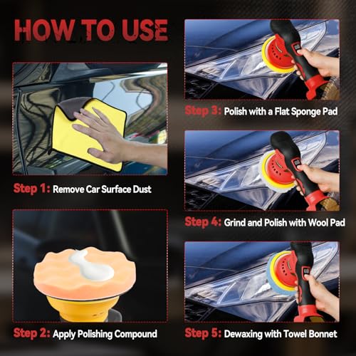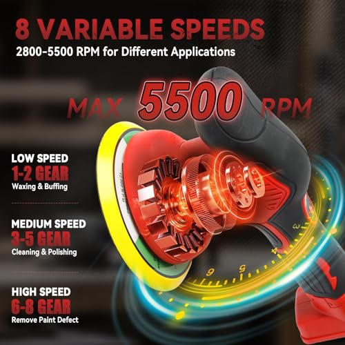 8-LEVEL SPEED CONTROL: With 8 levels of speed control (2800 rpm to 5500 rpm), the car buffer polisher allows you to experience the perfect polish. Whether you need gentle waxing, thorough polishing, or tough defect removal, this car buffer cordless delivers. Recommendations: 1-2 gear: gentle waxing; 3-4 gear: thorough polishing; 5-6 gear: removal of stubborn defects