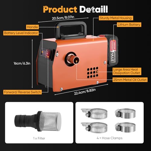 Universal Compatibility and Complete Accessories: The oil transfer pump is specifically designed for 1-inch hoses (hoses not included), offering strong versatility. It is suitable for liquid replacement and transfer in large trucks, engineering vehicles, harvesters, and small fueling equipment, including diesel and kerosene. The product includes the pump, hose clamps, and a filter, providing a complete set of accessories for easy use by customers.