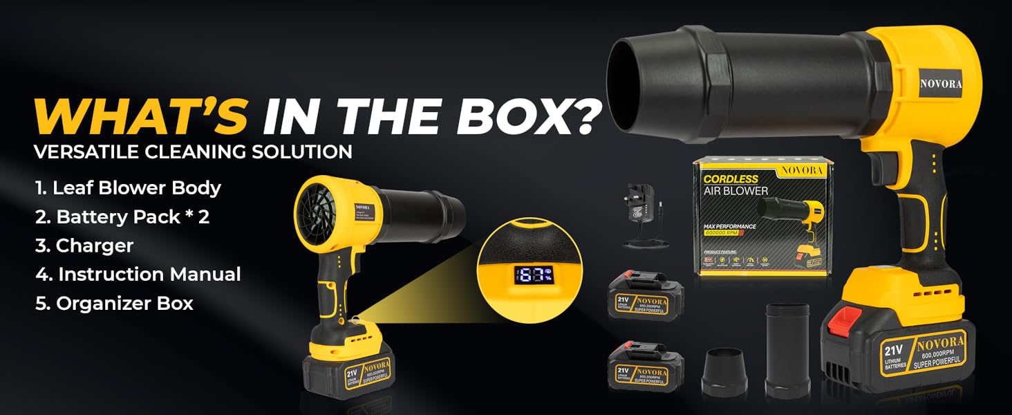 Complete Set with Accessories: Includes 1 NOVORA Cordless Blower, 2 lithium batteries, 1 fast charger, 1 storage box, and 2 nozzle attachments for flexible cleaning and easy storage.