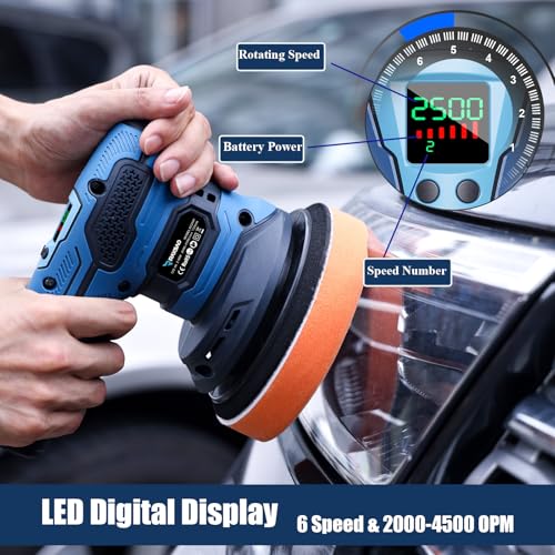 Cordless Polisher, 6INCH Polisher for Car Detailing, 6 Variable Speed to 4500OPM, Random Orbital Polisher with LED Display, Car Polishers and Buffers Ki