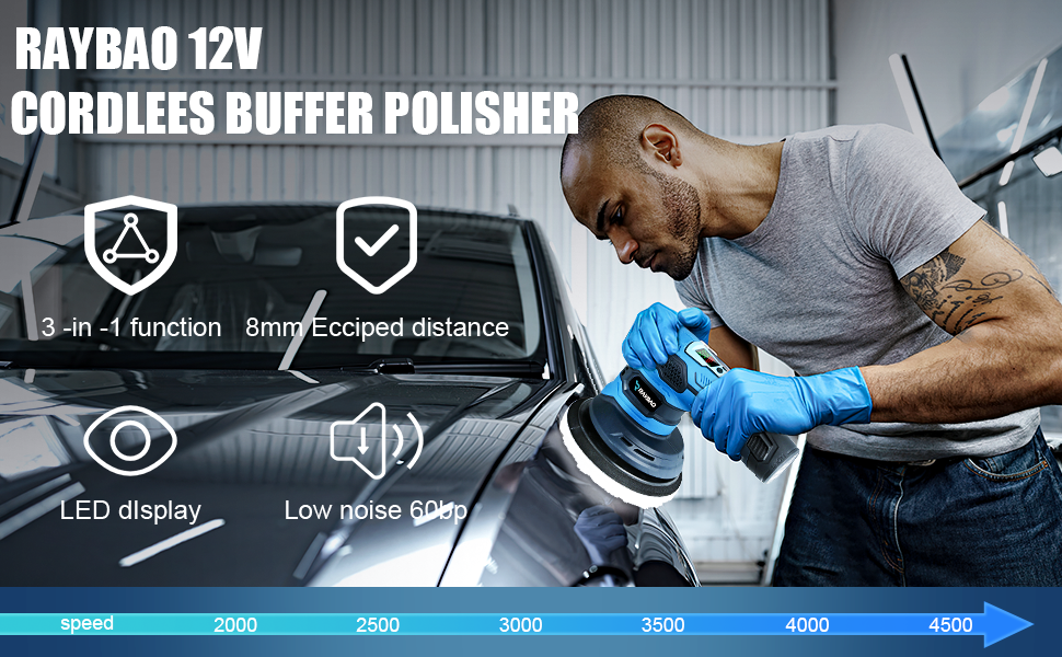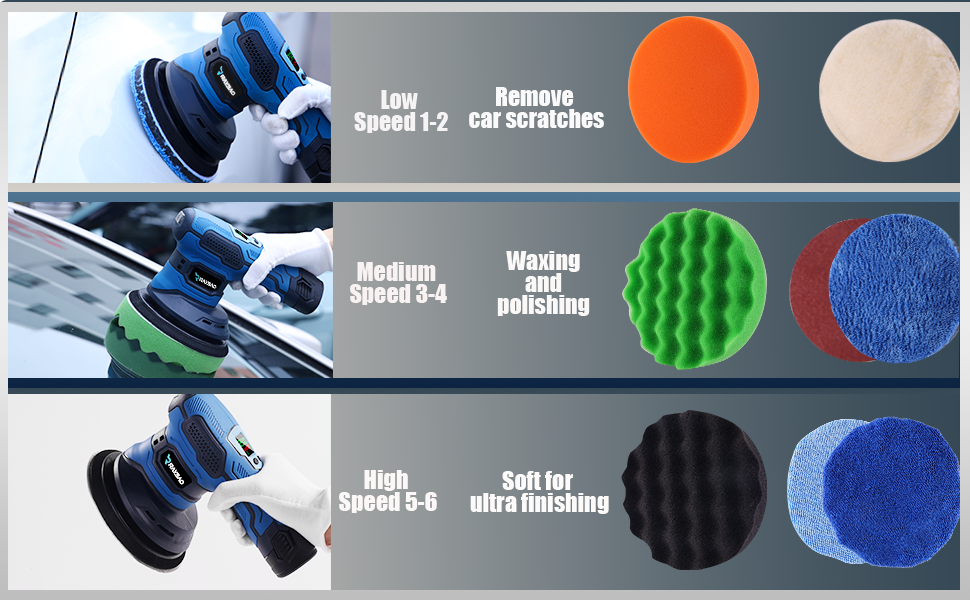 VARIABLE SPEED BUFFER POLISHER :This polishing machine features 6 variable speeds from 2500-4500OPM to help you finish the whole car polishing and detailing. Unique LED display design allows you to easily monitor speed and power consumption.