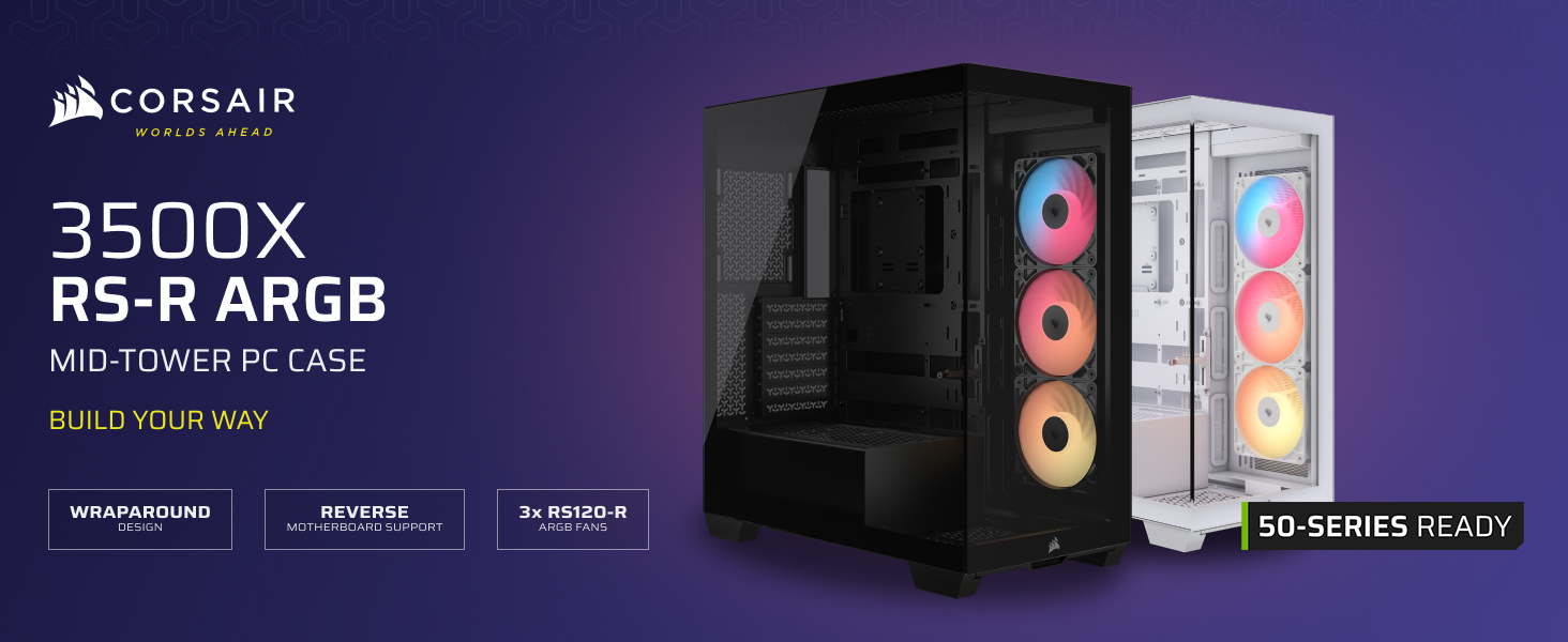 The CORSAIR 3500X RS-R ARGB Mid-Tower Glass PC Case offers powerful cooling and bold visuals in a clean, modern design framed by wraparound tempered glass panels. Three pre-installed RS120-R reverse rotor ARGB fans provide vibrant lighting and strong airflow, with easy lighting control through a standard +5V ARGB motherboard header. Its spacious interior supports large graphics cards, CPU coolers, and radiators up to 360mm for custom or all-in-one liquid cooling. Compatible with the latest reverse connection motherboards for a cable-free interior, the 3500X also includes a GPU Anti-Sag Stabilisation Arm to support your graphics card, while double-shot grommets improve cable routing for a cleaner build.