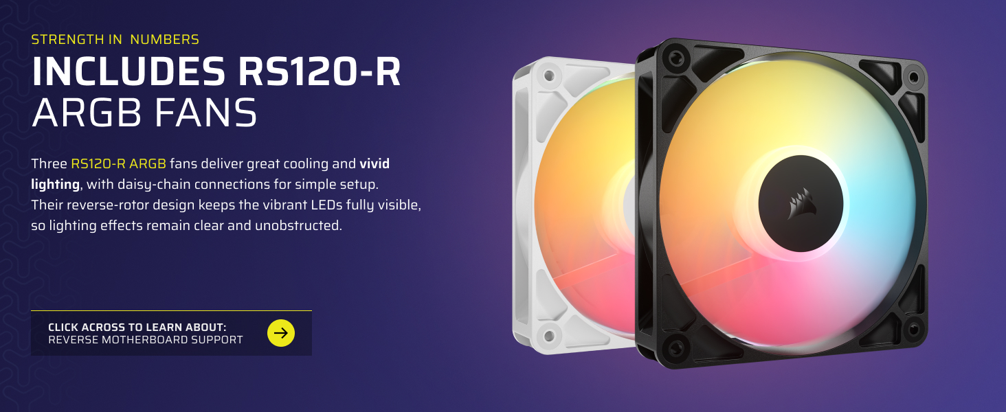 RS120-R ARGB Fans – Enjoy high-performance cooling and unobstructed lighting from three RS120-R ARGB fans, with simple motherboard control via a +5V ARGB header