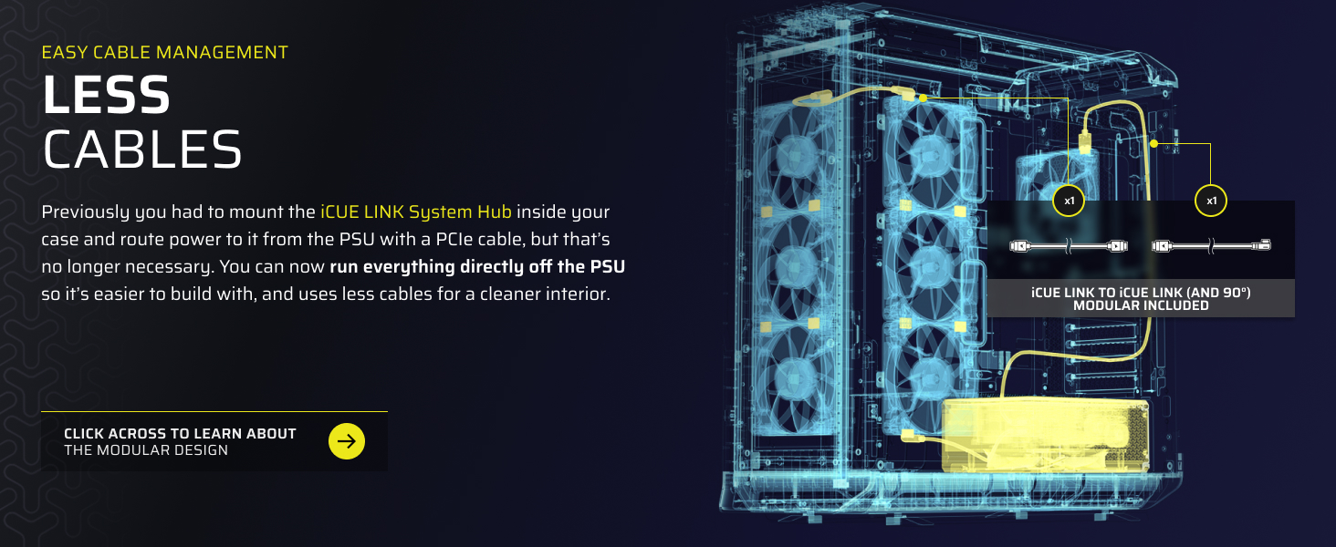 Less Cables – Previously you had to mount the iCUE LINK System Hub inside your case and route power to it from the PSU with a PCIe cable, but that’s no longer necessary. You can now run everything directly off the PSU so it’s easier to build with, and uses less cables for a cleaner interior