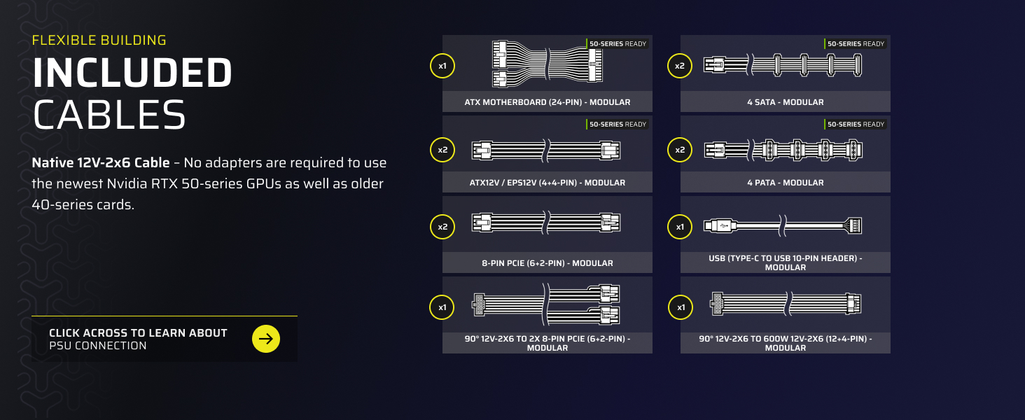 Dual Native 12V-2×6 Cable – No adapters are required to use the newest Nvidia RTX 50-series GPUs as well as older 40-series cards