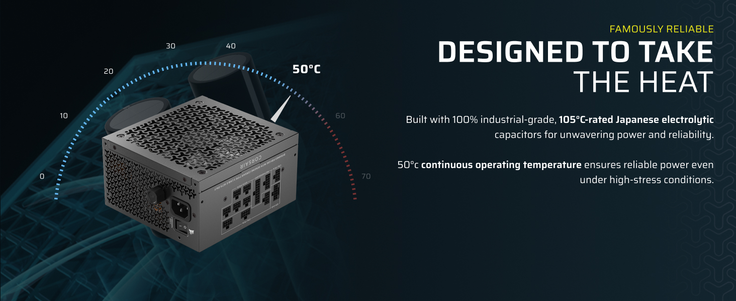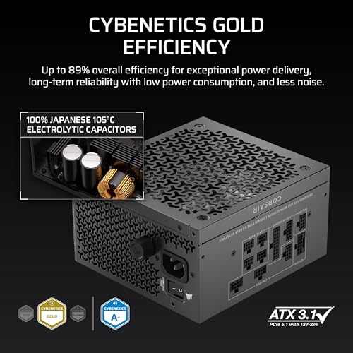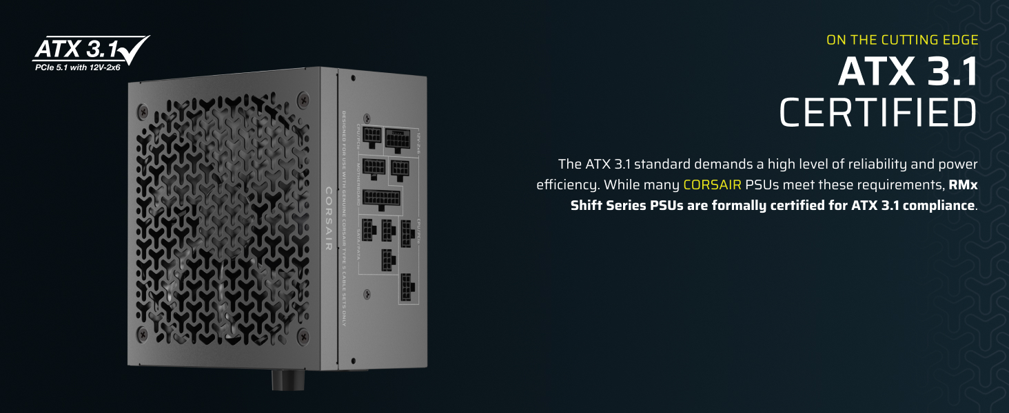 CORSAIR RMx SHIFT Series fully modular power supplies include a native 12V-2×6 cable for the latest GPUs, along with a side-mounted interface that keep connections easily accessible for Cybenetics Gold-certified efficiency. With ATX 3.1 compliance and an included debossed PVC cable kit, building and upgrading your PC is simpler than ever. Equipped with 105°C-rated Japanese capacitors for reliability, RMx SHIFT ensures long-term performance. A 140mm fluid dynamic bearing fan operates quietly, with Zero RPM mode for silent low-load operation. An adjustable fan speed knob lets you tailor cooling to your needs, offering quiet, efficient, and accessible power.