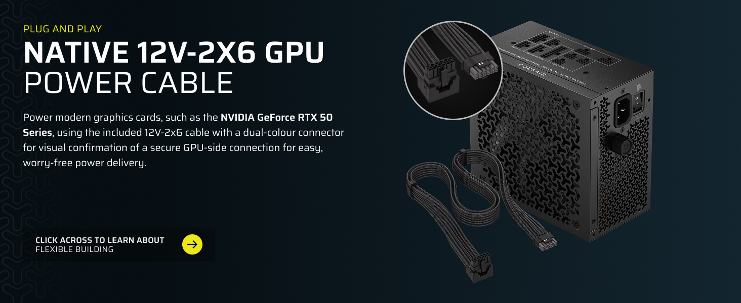 • Native 12V-2×6 GPU Cable: Easily power modern graphics cards such as the NVIDIA GeForce RTX 50 Series.