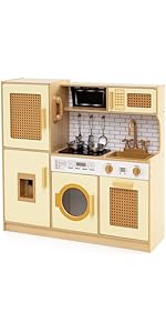 - 【Interactive Simulation Zones】This play kitchen isn’t just about “cooking”—it’s a non-stop activity hub. A realistic range hood, sink with faucet, slide-out trash bin and more interactive simulation zones—dish washer, microwave, oven and even a washing machine—keep the little chefs happily occupied.