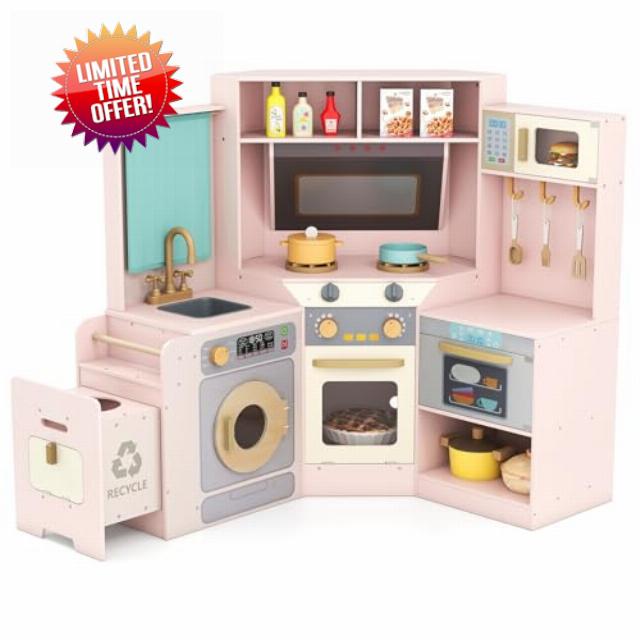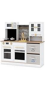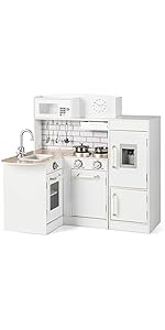 - 【Safe & Robust Construction】With safety and durability in mind, this corner play kitchen complies with EN71 and REACH, ensuring a risk-free environment for your kids. Its sturdy wooden construction with a splinter-free surface and rounded edges ensures it stands up to the enthusiastic play of young chefs.