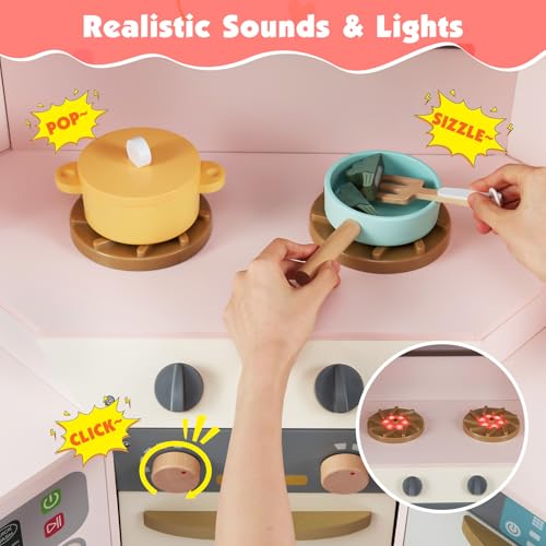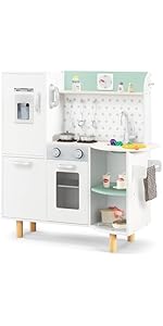 - 【Cook Like A Real Chef】Inspire your child's imagination with our engaging play kitchen, designed with realistic lights and sounds from the double stoves. The control knobs produce a satisfying "click," mirroring the true feeling of operating a kitchen. It's not just play; it's an immersive culinary adventure!
