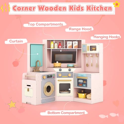 COSTWAY Kids Play Kitchen, Wooden Corner Pretend Kitchen