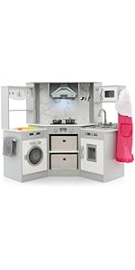 Ignite your child’s creativity with our corner play kitchen, an immersive wooden playset packed with double stoves with realistic sound and light effects for an authentic chef experience. Designed with a space-saving corner design, this kids’ play kitchen fits neatly in any room and features interactive zones like an oven, dishwasher, microwave, and even a washing machine. Complete with the pot and pan, play food, utensils and spices, it provides endless imaginative play for little chefs aged 3 and up. Let your budding chef cook, clean, and learn teamwork in style with this all-in-one corner kitchen—a perfect gift for birthdays or holidays!
