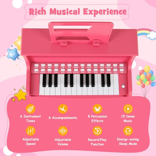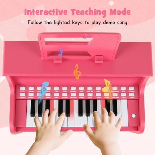 COSTWAY Wooden Kids Piano, 25 Key Toddler Digital Keyboard with Stool, Adjustable Speed & Volume, Removable Music Stand, Educational Music Instrument for Boys Girls (Pink)