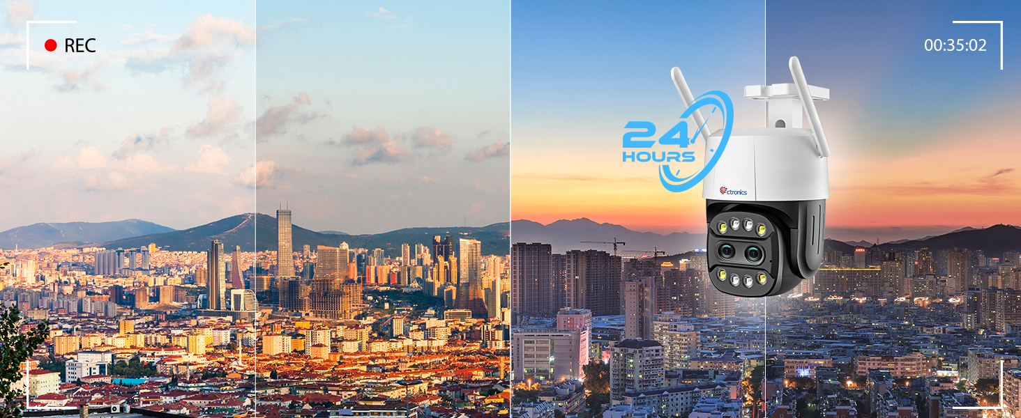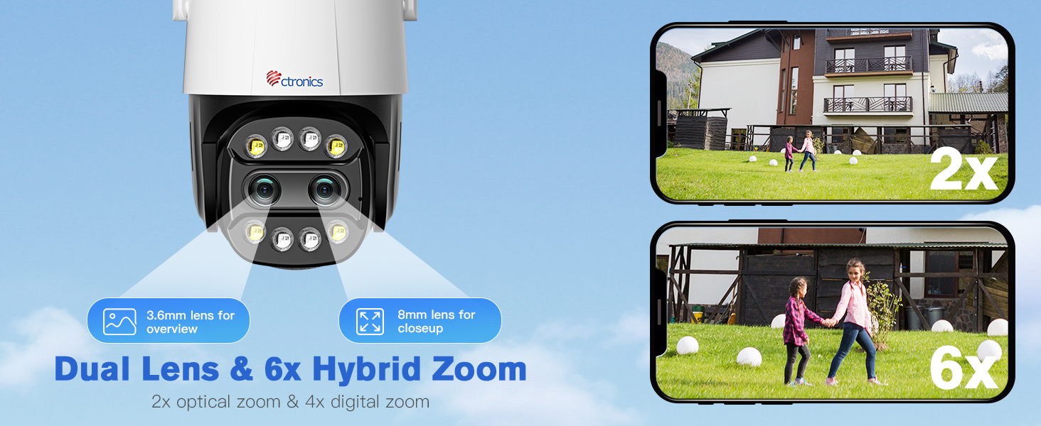 - [Dual Lens & 6X Hybrid Zoom] The Ctronics security camera outdoor with dual lens features a multi-layer lens design capable of switching focal lengths with one click through the Ctronics Pro on mobile phones and HIP2P on computers, focusing directly on the area you want. When 6x hybrid zoom is set up manually, this CCTV outdoor security camera can easily track with automatic 2x optical zoom and manual 4x digital zoom to follow the target.