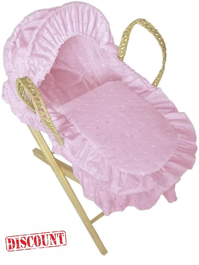 Cuddles Collection Dolls Moses Basket With Stand – Broderie Anglaise Bedding, for Kids & Toddlers (Pink)