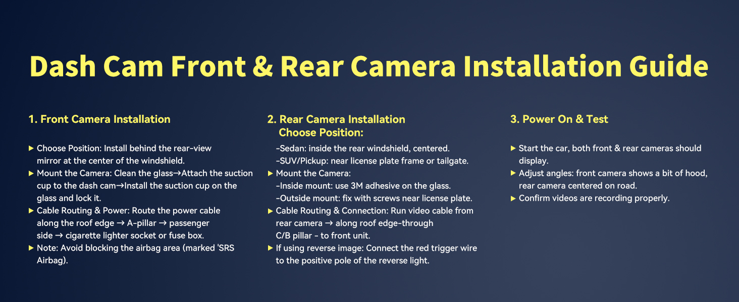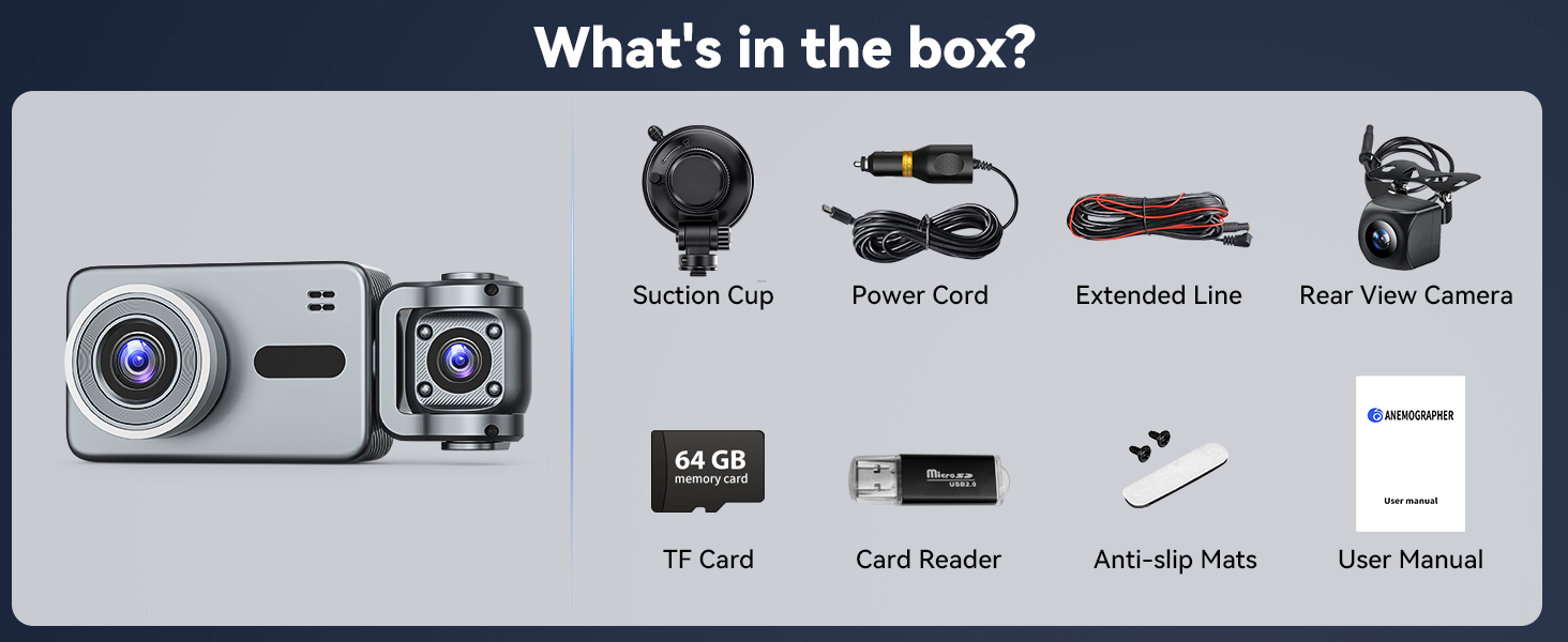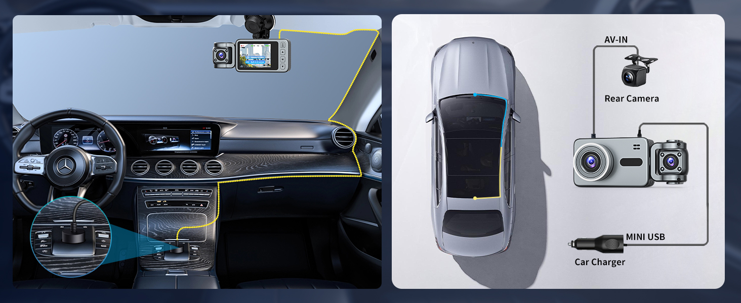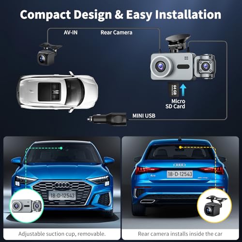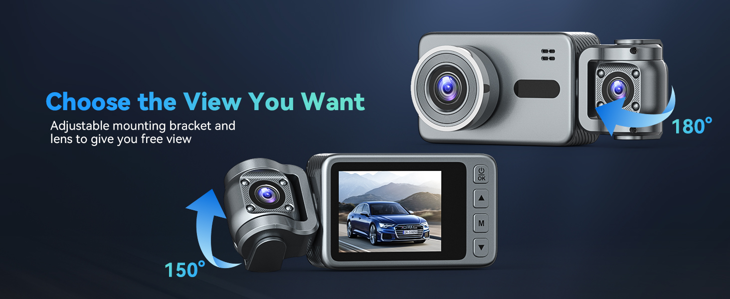 - Compact Design, Voice Prompts & Easy Installation ➤ The discreet 3" dash cam is easy to mount with a detachable and adjustable front cam (120°) and a 360° rotatable rear camera. Voice prompts notify you of recording status and emergency locks, offering full control and convenience.