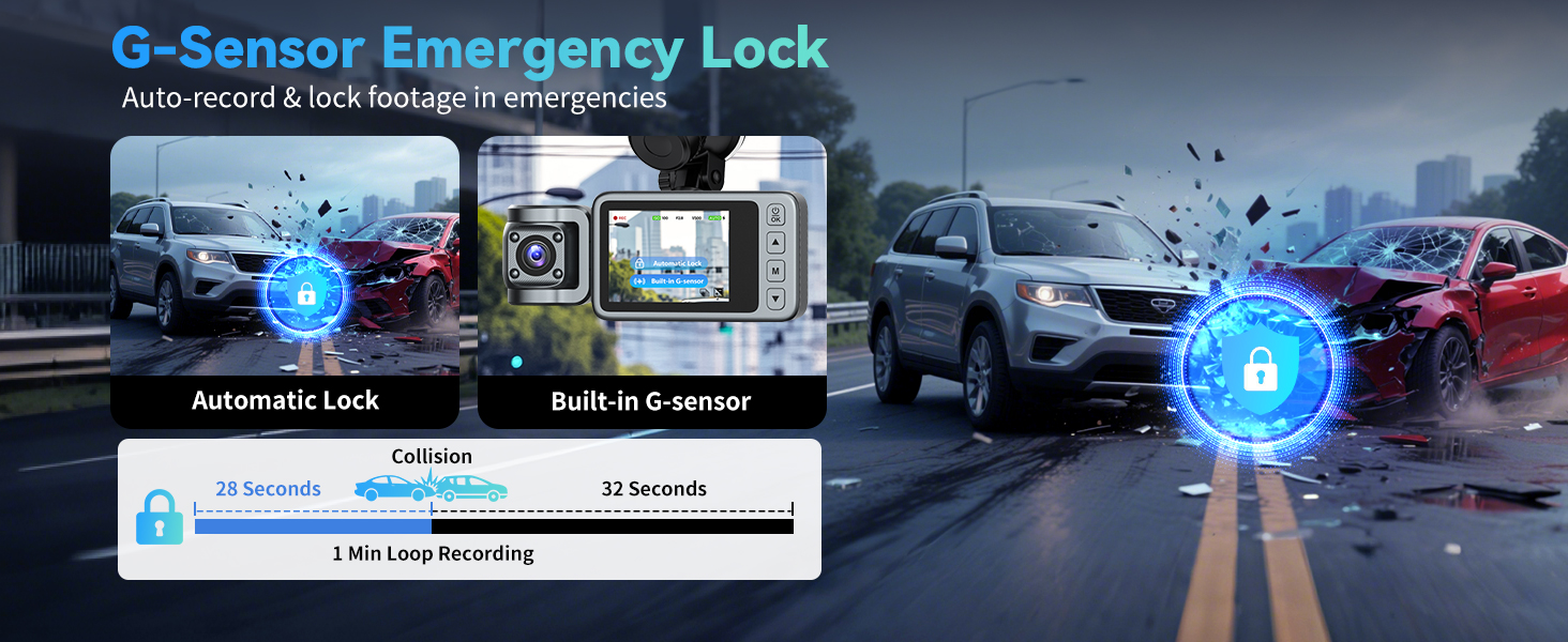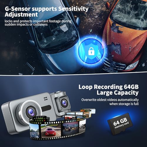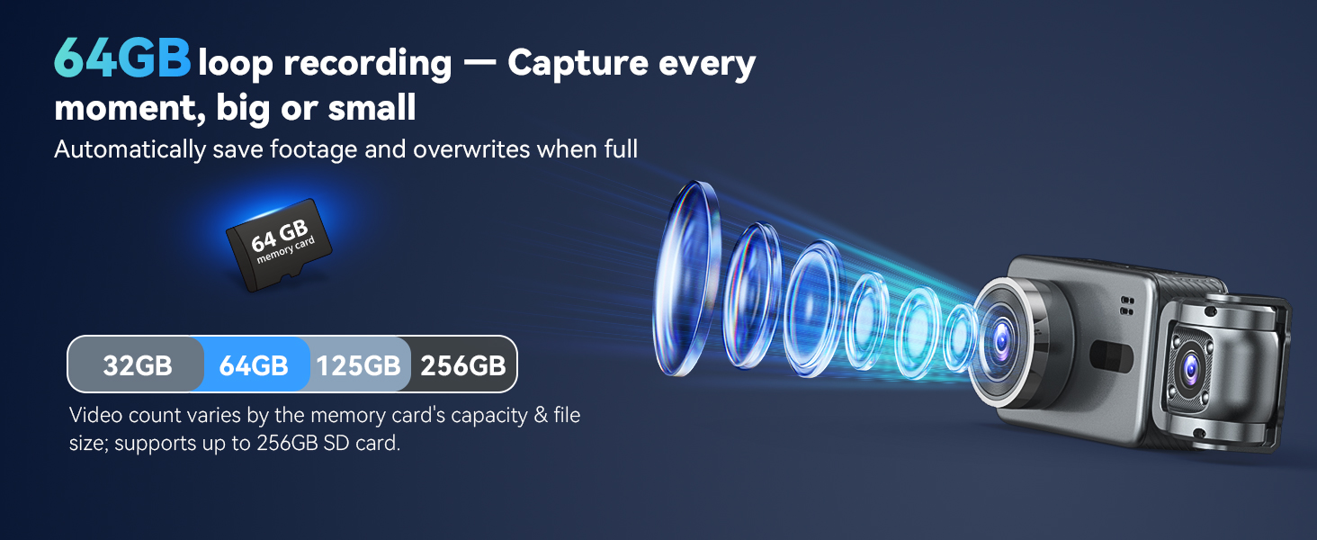 - Loop Recording with G-Sensor Emergency Lock ➤ Seamless loop recording overwrites old files automatically, while the built-in G-sensor locks and protects important footage during sudden impacts or collisions. Includes 64GB SD card (supports up to 256GB). High resolution and a powerful processor ensure clear videos, making it reliable for capturing crucial evidence.