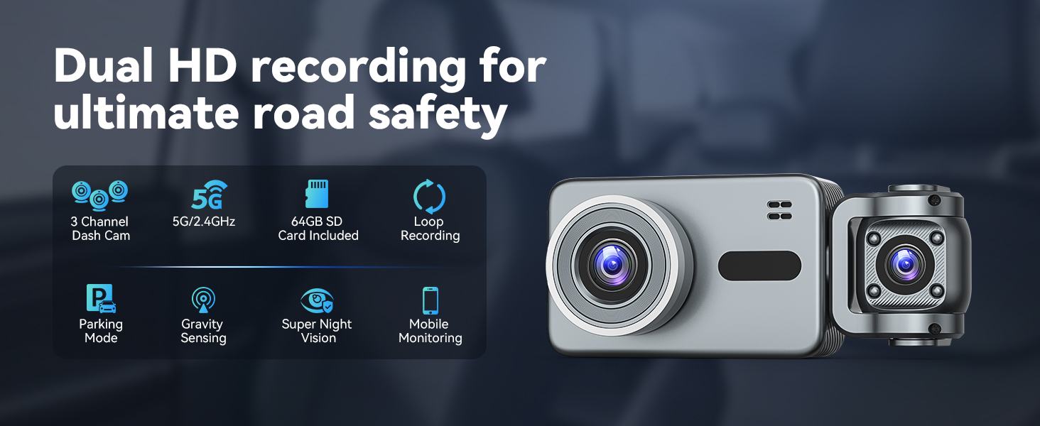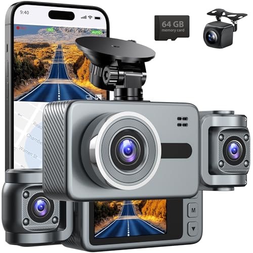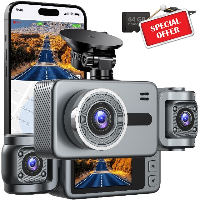 Dash Cam Front and Rear, 3 Channel Dashcam Car Camera with 64GB SD Card, Wi-Fi, Night Vision, 3″ IPS Display, G-Sensor, APP Control, Loop Recording for Cars, Vans, Trucks (Gray)