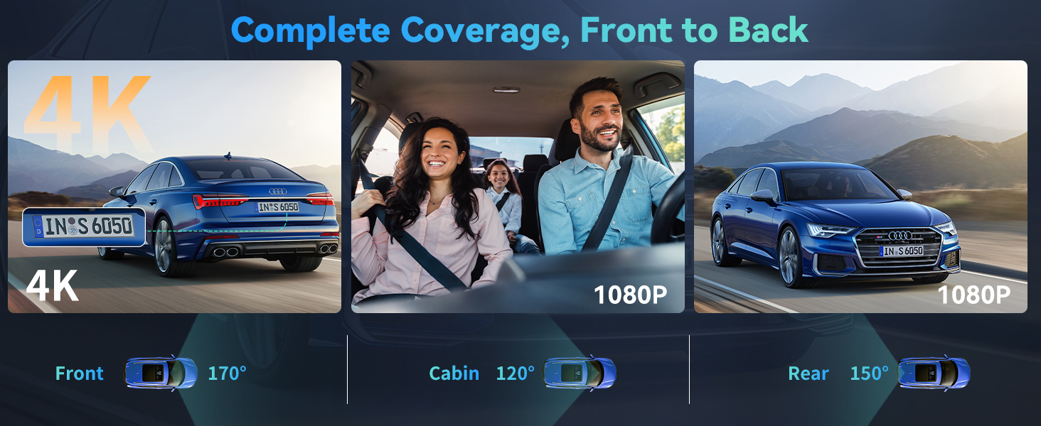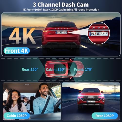 - 3-Lens Clarity & Wide Coverage ➤ Compared with the traditional 2.5K dash cam, the 4K pixel has a clearer image quality. When the dash cam is recording, the license plate of the car in front can be clearly captured. The front camera has a 170° wide angle, the left and right cameras have a 120° wide angle, and the rear camera has a 150° wide angle, which can achieve all-round recording without blind spots.