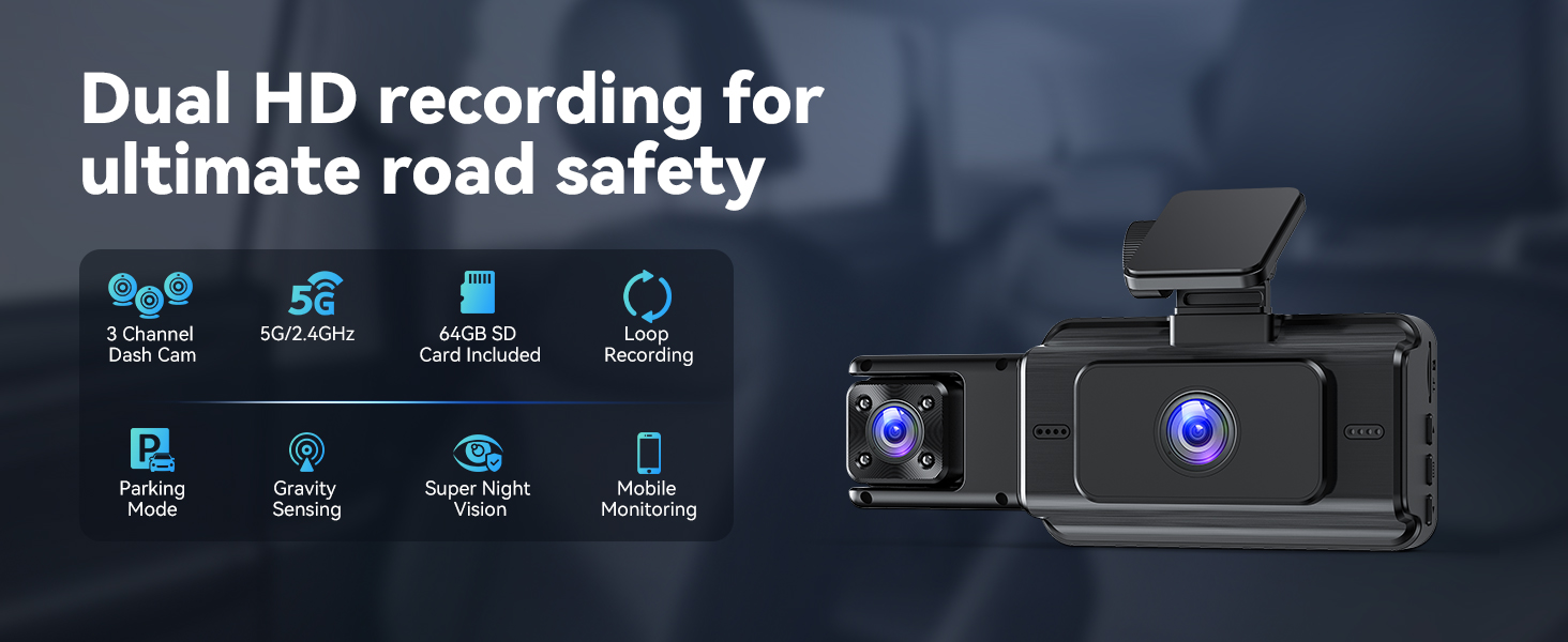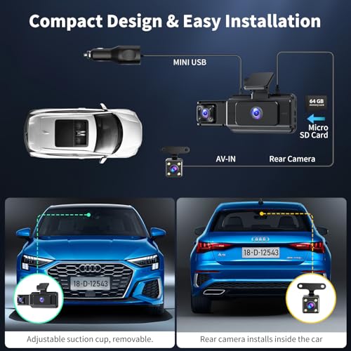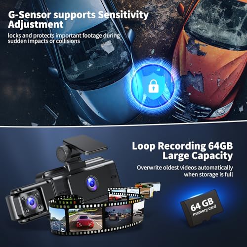 Dash Cam Front and Rear, 3 Channel Dashcam Car Camera with 64GB SD Card, Wi-Fi, Night Vision, 3″ IPS Display, G-Sensor, APP Control, Loop Recording for Cars, Vans, Trucks (Black)