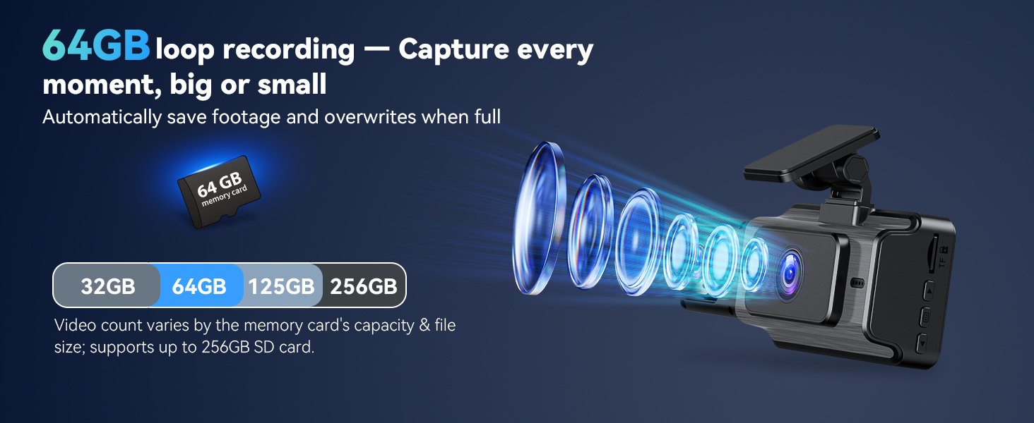 - Loop Recording with G-Sensor Emergency Lock ➤ Seamless loop recording overwrites old files automatically, while the built-in G-sensor locks and protects important footage during sudden impacts or collisions. Includes 64GB SD card (supports up to 256GB). High resolution and a powerful processor ensure clear videos, making it reliable for capturing crucial evidence.