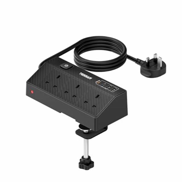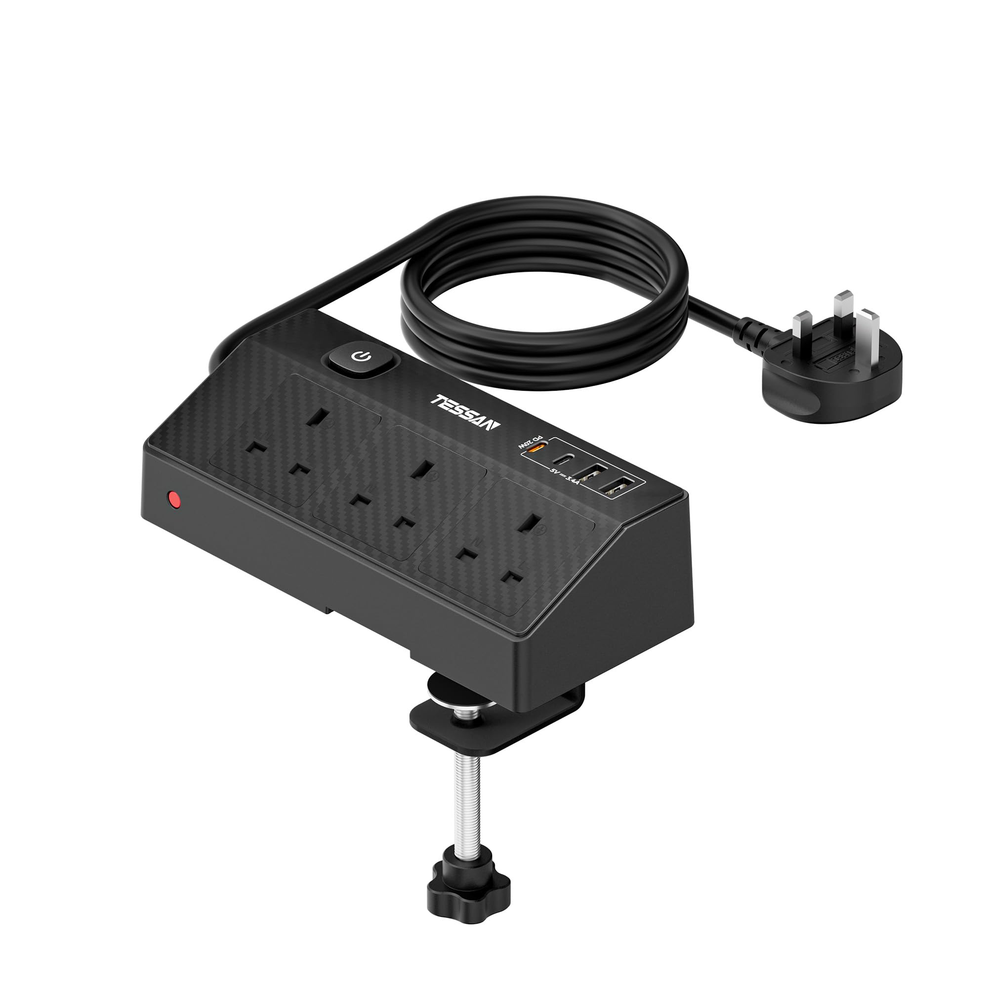 Desk Extension Lead with 4 USB Slots, TESSAN 3 Way Desktop Power Socket with PD 20W USB C Fast Charger, Power Strip with Removable Clamp, Plug Extension with 1.8M Cable for Office, Home Supplies