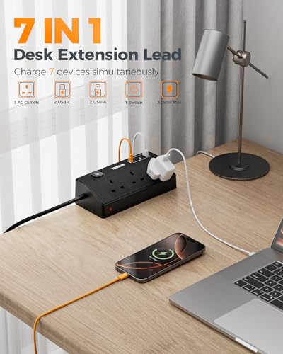 - 7 in 1 Power Extension: This USB plug UK can turn 1 socket into 3 AC outlets (3250W Max) and 4 USB ports, charge 7 devices simultaneously without blocking; Black Extension lead with switches suitable for various indoor spaces
