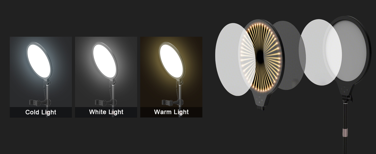 Photography ring light: multiple lighting options Just press the mode switch, with 3 adjustable colours of white, warm and natural light and 10 brightness levels, 30 possibilities in total to meet all your needs for different occasions, such as photography, streaming, make-up, content creation, etc. The temperature range is from 3000K to 6000K, giving the light a more natural look.