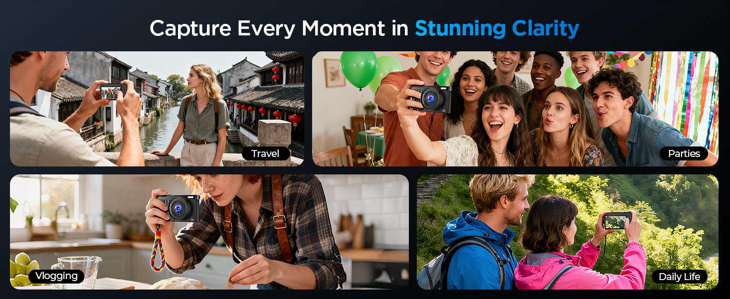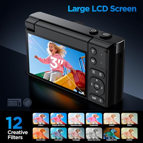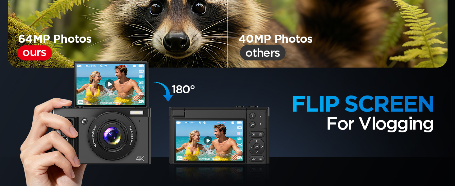 4K Video & Flip Screen for Vlogging : This compact digital camera captures ultra-clear 4K video and sharp 64MP photos. Its 180° flip screen is perfect for vlogging, selfies, and action photography on the go. Ideal for teens, kids, beginners, and anyone starting their digital content journey.