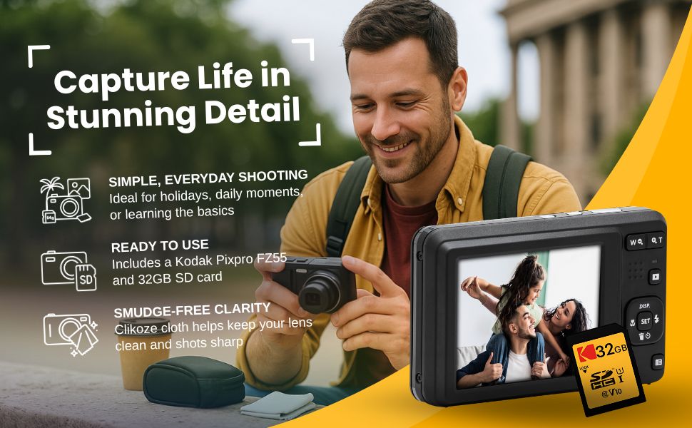 - User-Friendly Compact Camera for All Levels: Whether upgrading or just starting out, this Kodak Pixpro digital camera with SD card offers simple point-and-shoot ease. Great for everyday photography and learning the basics