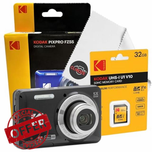 Digital Camera Set Bundle with Kodak Pixpro FZ55 Black Compact Digital Camera, 32gb SD Card, and Clikoze Cleaning Cloth