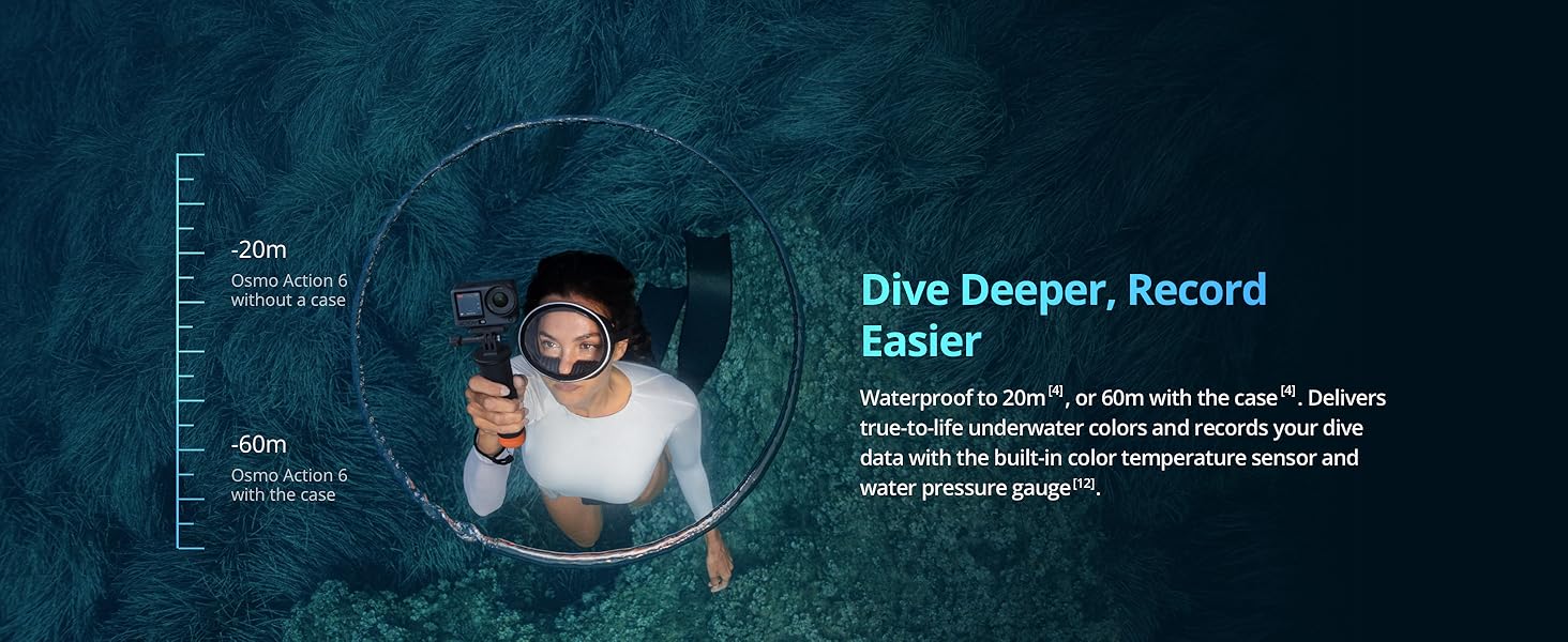 - Built Tough, Dive Deeper – Go underwater up to 20m without a case [4]. Vlog, surf, or swim with this waterproof camera and capture every splash in stunning 4K.