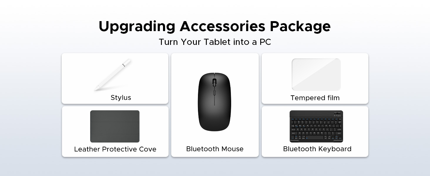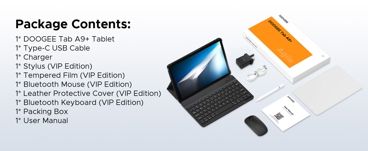 - 【All-in-one Package】When you buy DOOGEE TAB A9+ tablet with keyboard, you get more than just a tablet; it's an all-in-one package that includes all the accessories you need to protect and maintain your device. In addition to the tablet, pressure-sensitive pen, mouse and keyboard, it also includes a universal power adapter, data cable, and business leather case.