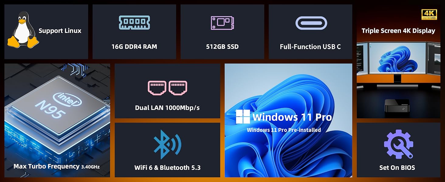 【OS Preinstalled + Linux Support】 Comes preloaded with Windows 11 Pro, supports Linux systems. Advanced BIOS features include Wake-on-LAN, PXE boot, and auto power-on.