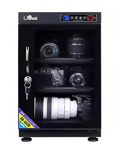 Easy-to-Use: Powers on instantly; adjust humidity via buttons. Built-in LED lights; adjustable/removable shelves fit cameras, lenses, collectibles.