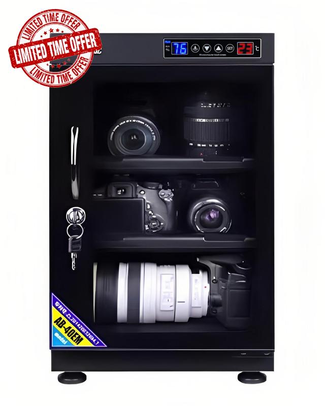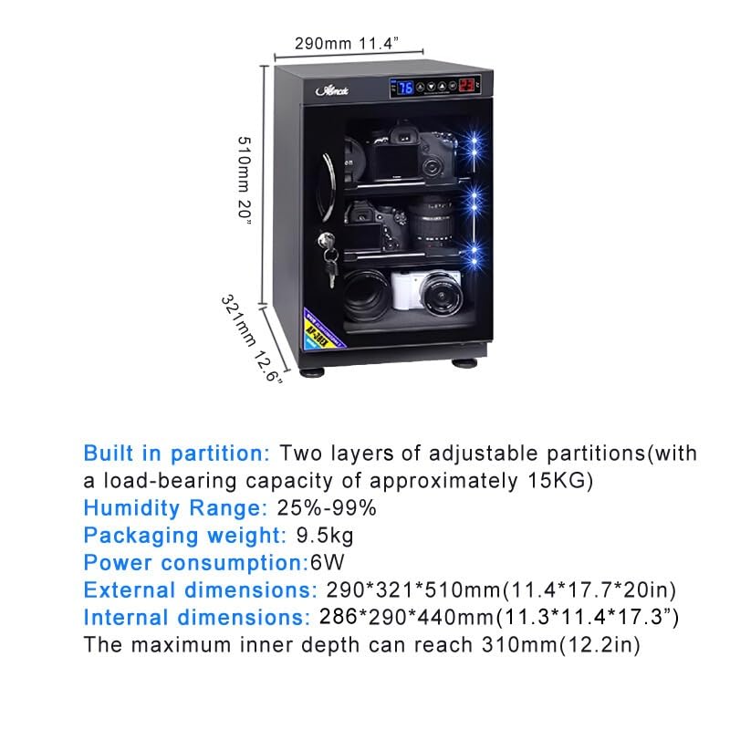Condensation drying system keeps your favorite DSLR camera lens, stamps from humidity and degradation Automatic control the humidity Digital display Adjustable shelf design Toughened glass door with keys Soft LED light of the inner cabinet Power Consumption: 5V2A Humidity Range: 25% ~ 70%RH Applicable Voltage: AC 100V ~ 240V