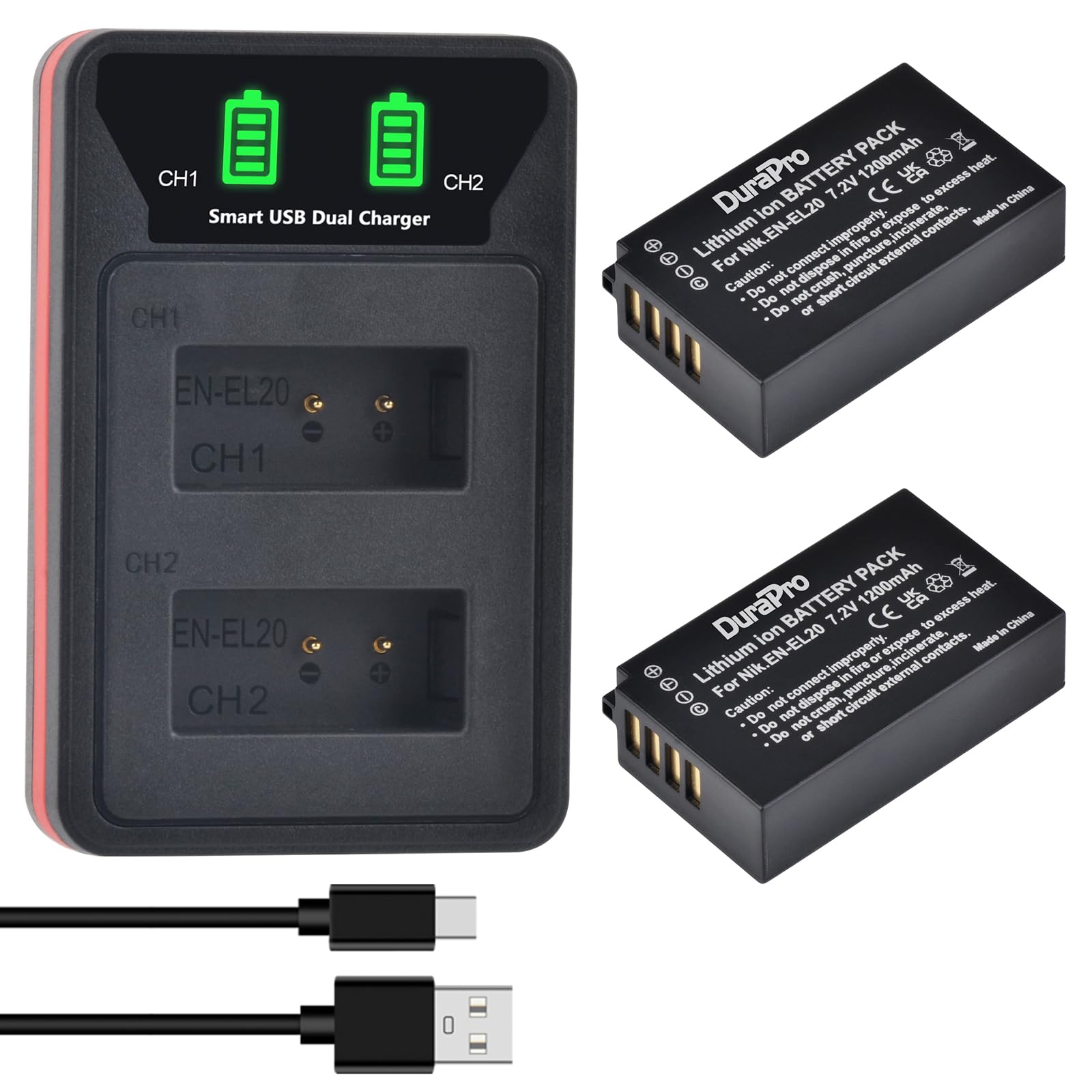 - Package includes: 2X EN-EL20 Batteries + LCD USB Dual Charger + Charging Cable + Manual.