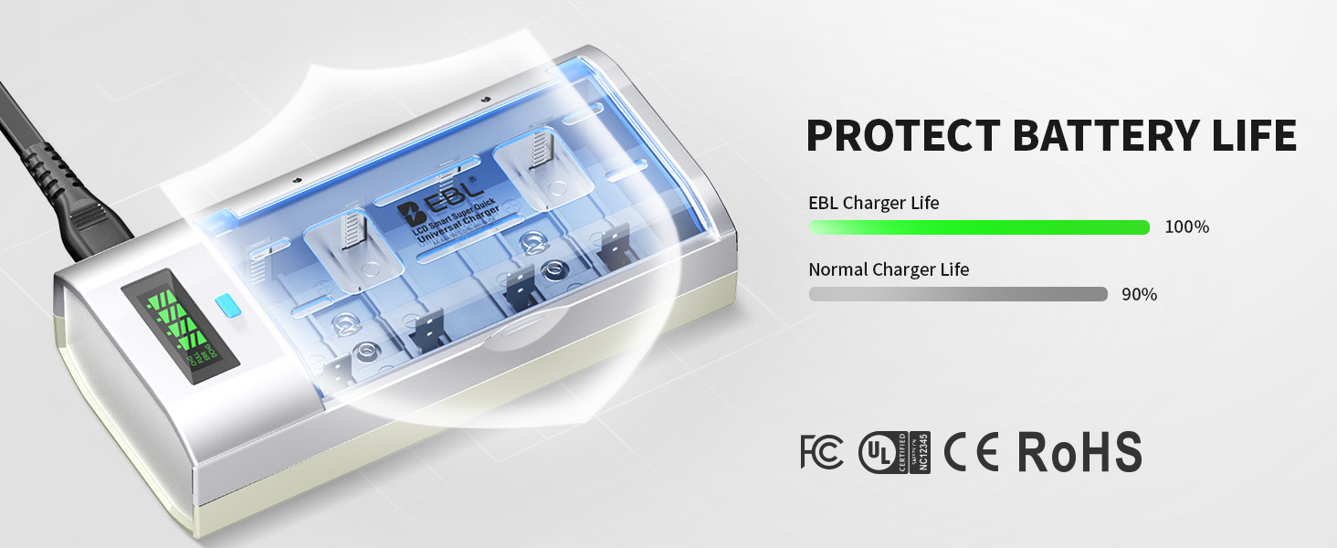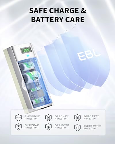 - 【Charge with Total Safety, Care for Your Batteries】EBL chargers are engineered with a comprehensive protection system to ensure both your safety and your battery's longevity. Featuring Short-Circuit, Over-Voltage, Over-Charge, Over-Heating, Over-Current, and Reverse Battery Protection, they deliver intelligent monitoring throughout the charging process.