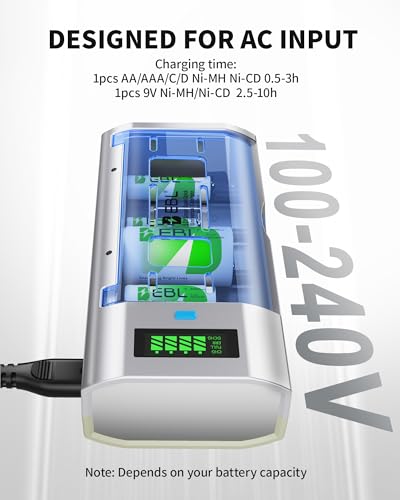 - 【Designed for AC Input】Engineered for direct wall outlet use, this EBL charger delivers rapid, reliable power. It efficiently charges 1-4 AA/AAA/C/D Ni-MH/Ni-CD batteries in just 0.5-3 hours, and a 9V battery in 2.5-10 hours*. Perfect for home, office, or any standard AC outlet.