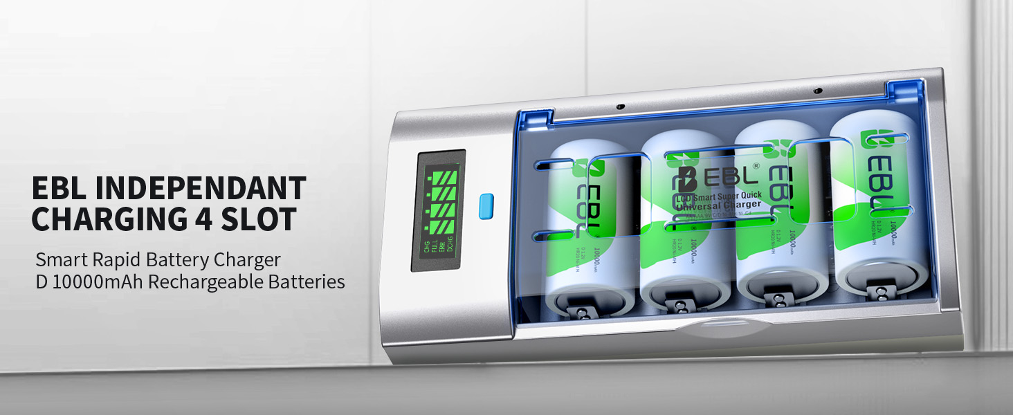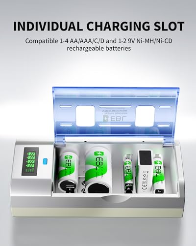 - 【Charge Smarter, Not Harder with Individual Slots】 This EBL charger features independent charging bays that are compatible with 1-4 AA/AAA/C/D or 1-2 9V Ni-MH/Ni-CD rechargeable batteries. Its flexible design allows you to mix and match different sizes and charge them all at once, providing total control and efficient power management for all your devices.